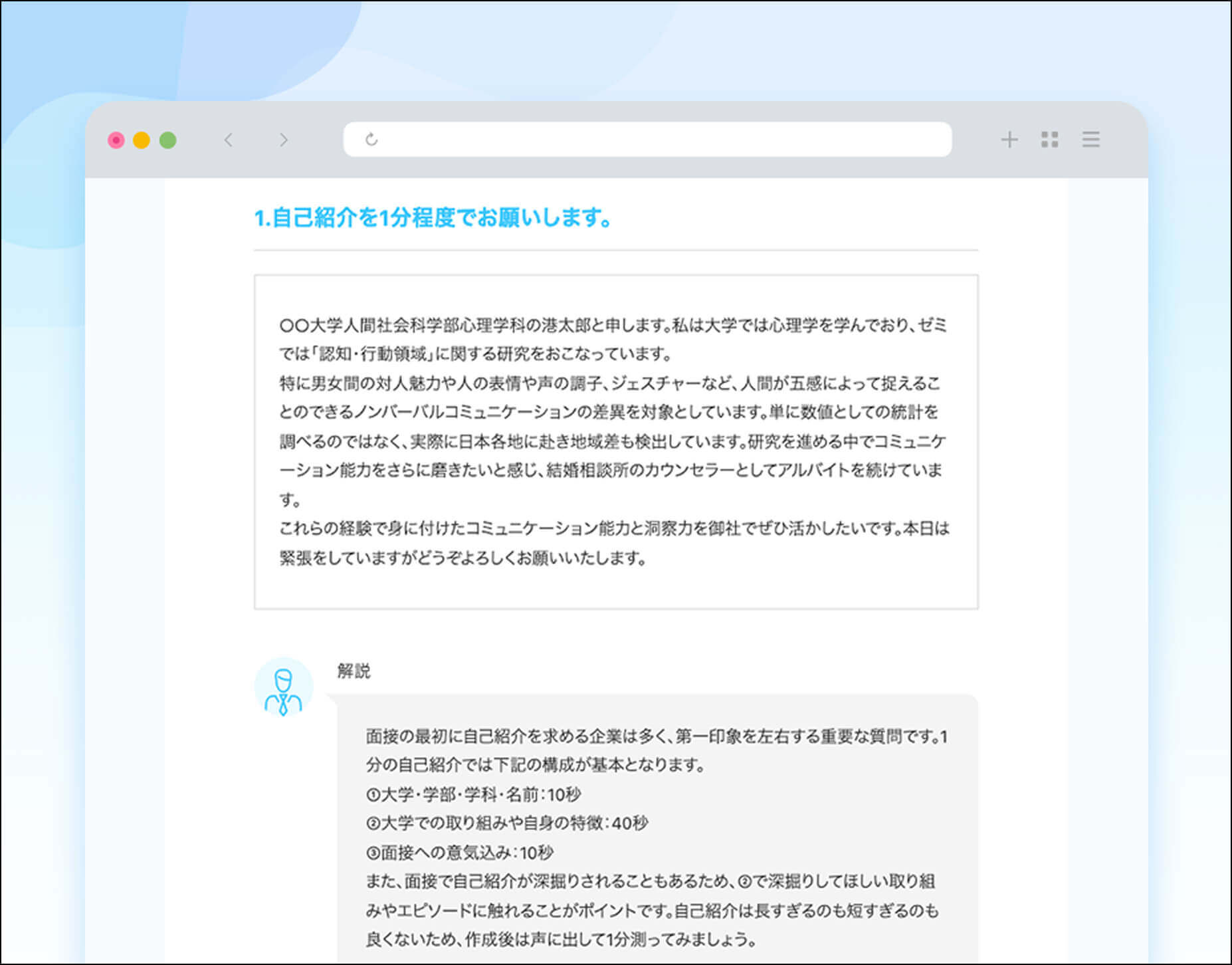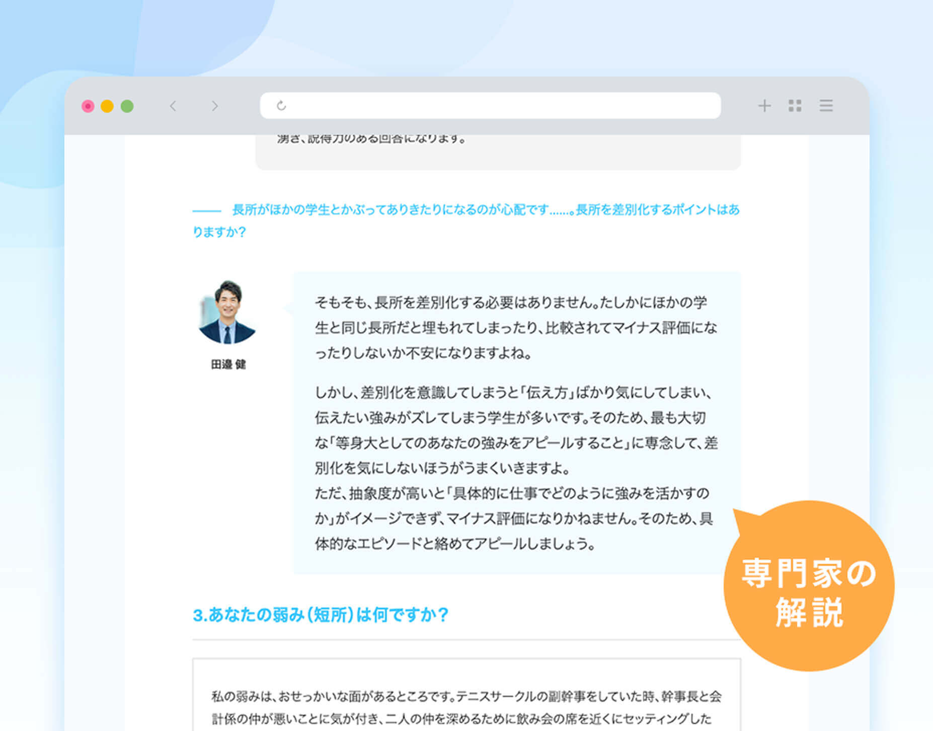 性格・学生時代の経験・志望動機などカテゴリ別の回答例と解説コメント、専門家のアドバイスを読むと構成の流れが見えてきます。