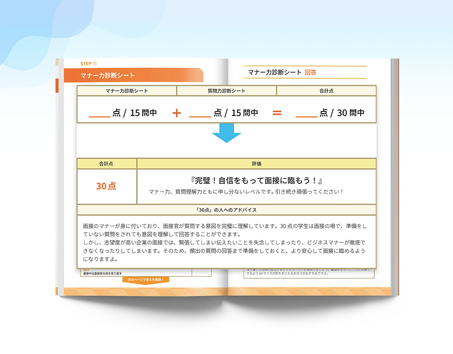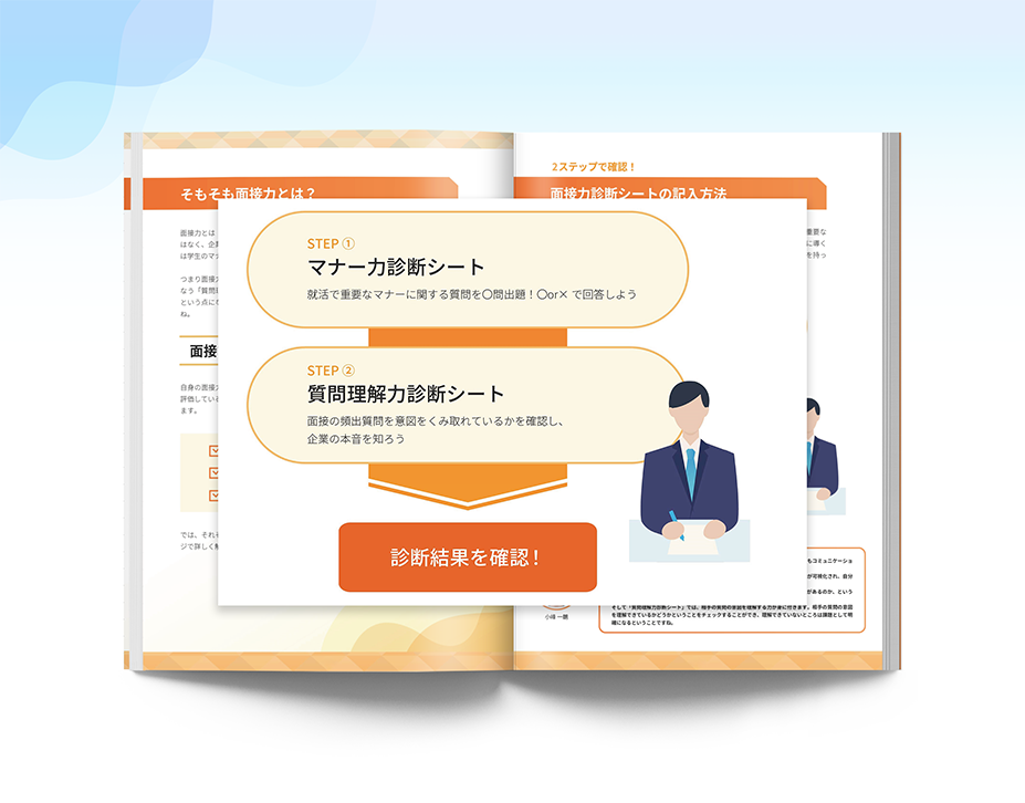 就活のプロが監修した、面接に不可欠な「マナー力」と「質問理解力」を診断するツールです 。2種類の診断シートで自身の弱点を点数化し、総合的な面接力を客観的に把握できます。さらに、人事が実際に使う面接評価シートも掲載。自身の課題を明確にし、面接官の評価基準を具体的に解説することで、面接の通過率向上をサポートします。