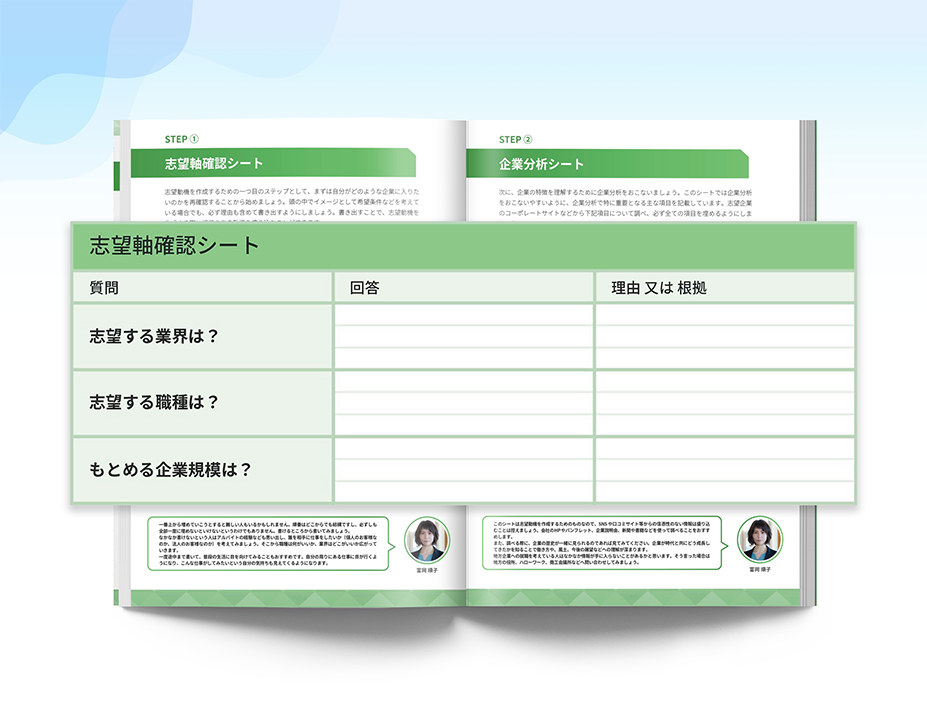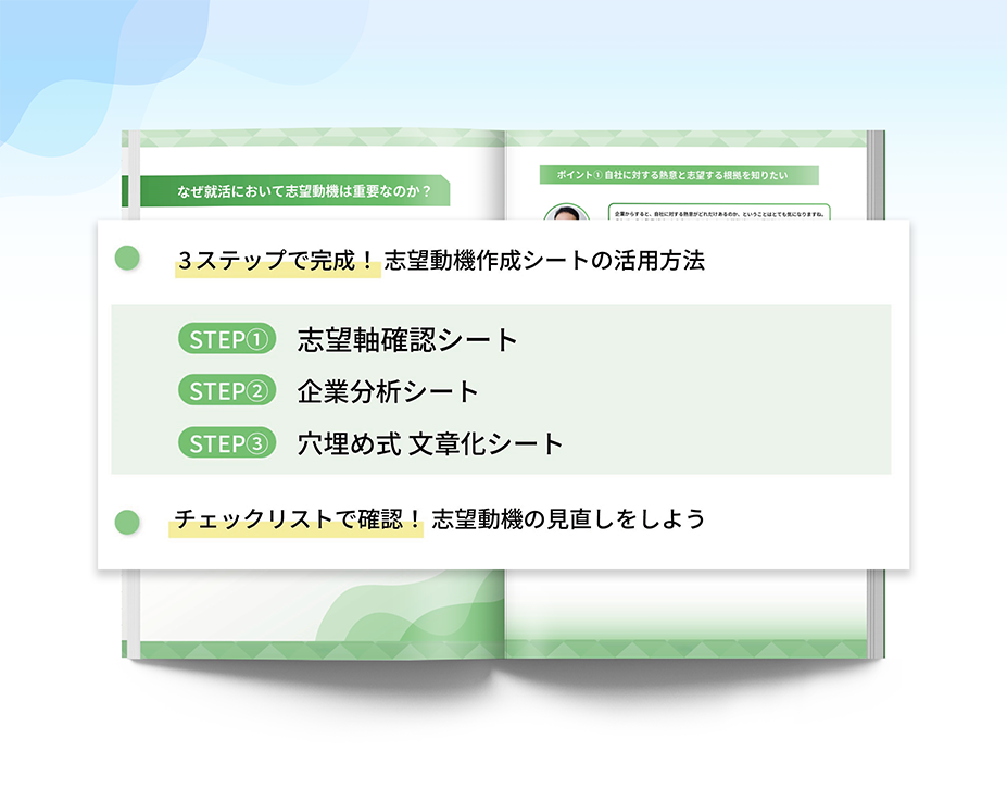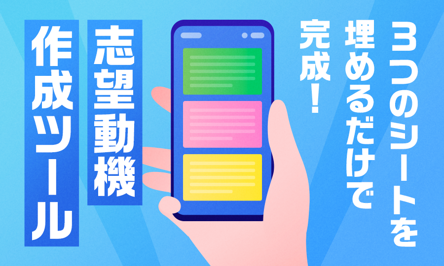 「志望軸確認シート」「企業分析シート」「穴埋め式 文章化シート」の3つのシートを活用すれば、シートを埋めていくだけで魅力的な志望動機が作成できます。