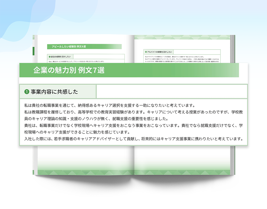 就活のプロが監修した、「志望軸の確認」「企業分析」「文章化」の3ステップで、企業に響く志望動機を作成できるツールです。自身の就活軸と企業の特徴をそれぞれシートで整理し、穴埋め式で文章化するため、誰でも論理的な志望動機が作れます。企業の魅力や自身の経験別の豊富な例文集や最終チェックリストも収録し、作成から見直しまで一貫してサポートします。