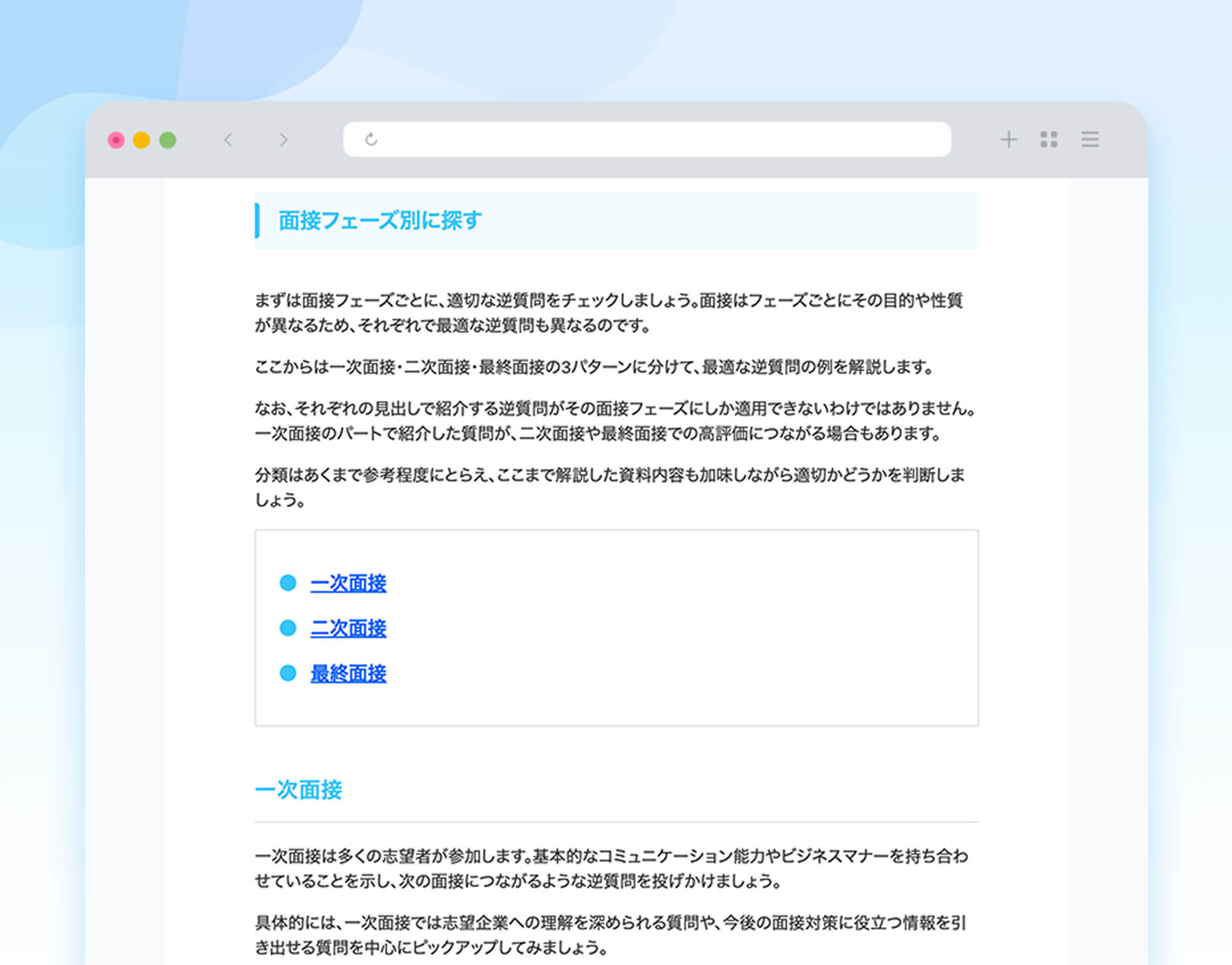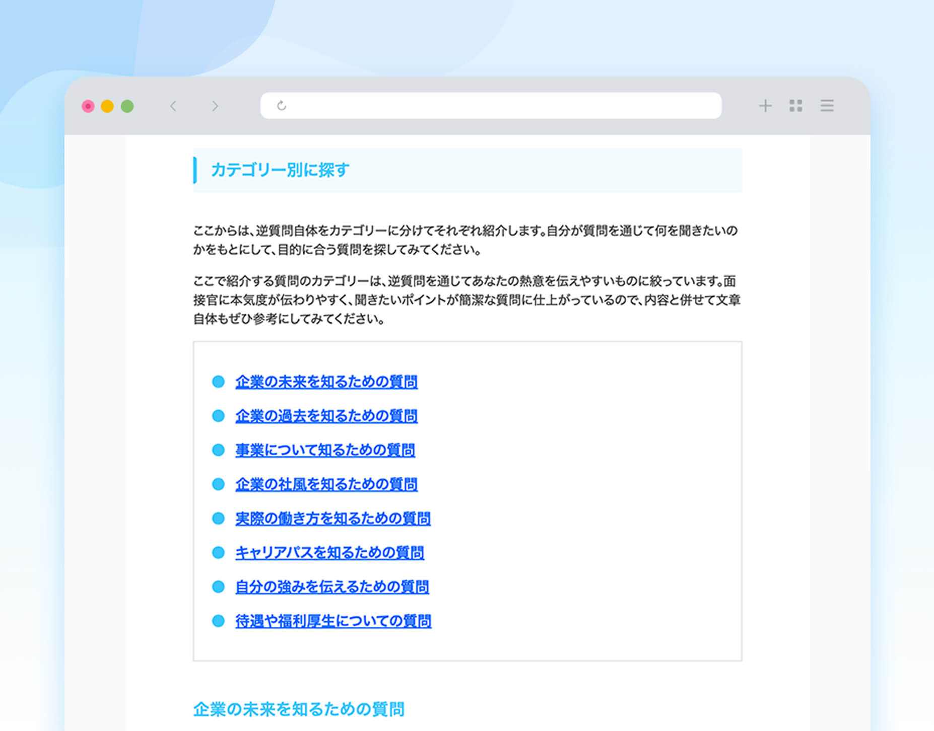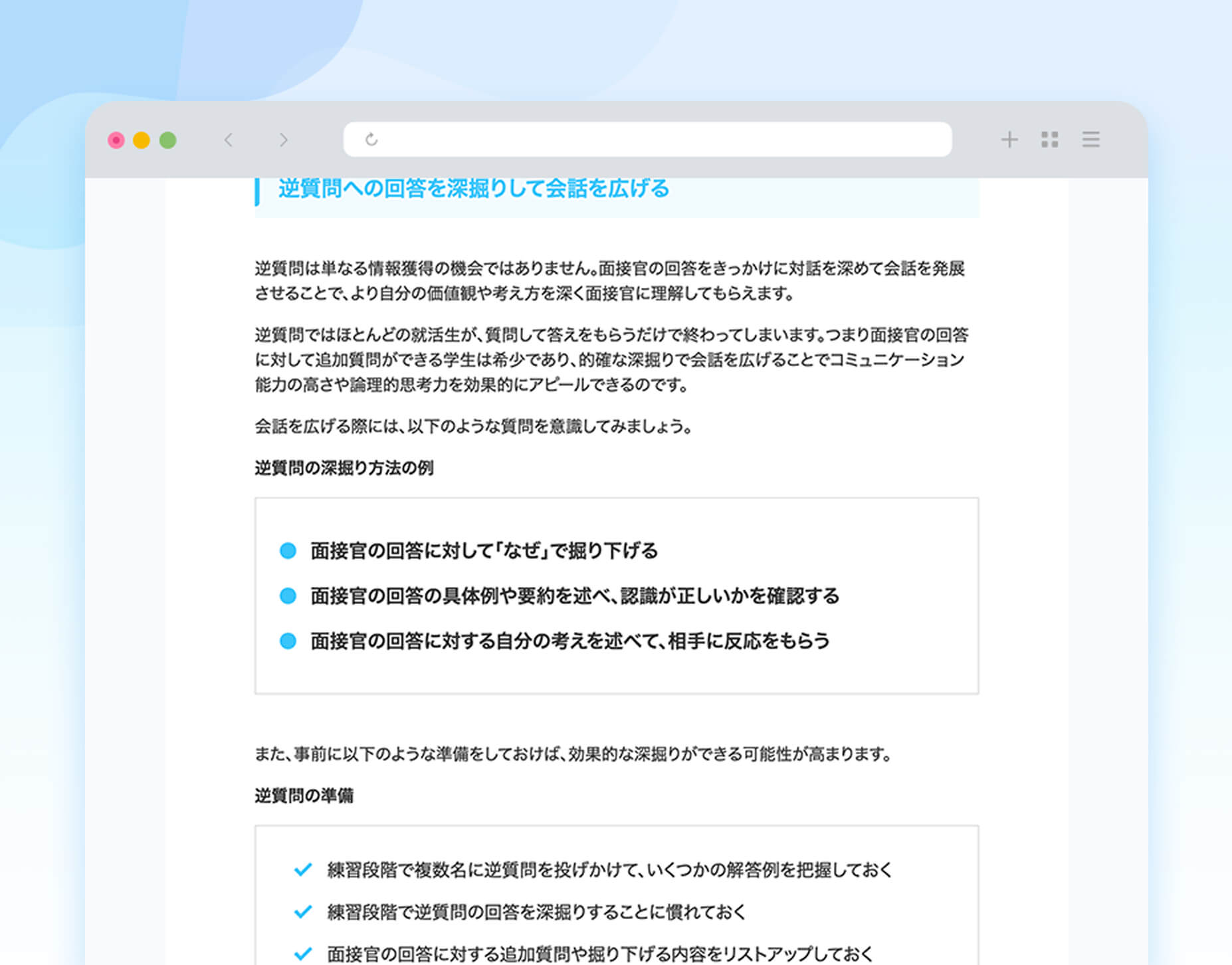 まずは「逆質問で面接官が見ているポイント」「NG例文集」を読み、逆質問の重要性や評価の仕組みを理解します。