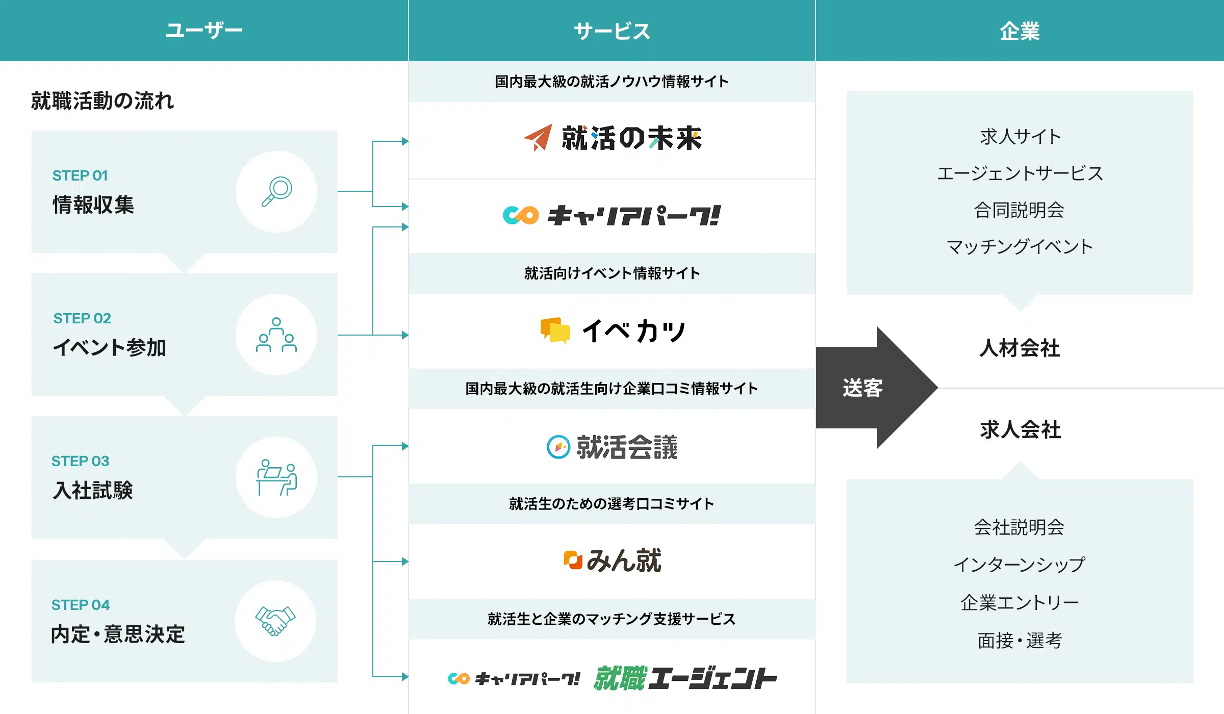 「キャリアパーク!」「就活会議」「みん就」などの自社メディアでは、企業情報や選考対策など、意思決定に役立つ情報をいつでも・どこでも得られる環境を整備。求職者が自身のペースで「知る」ことを支援します。